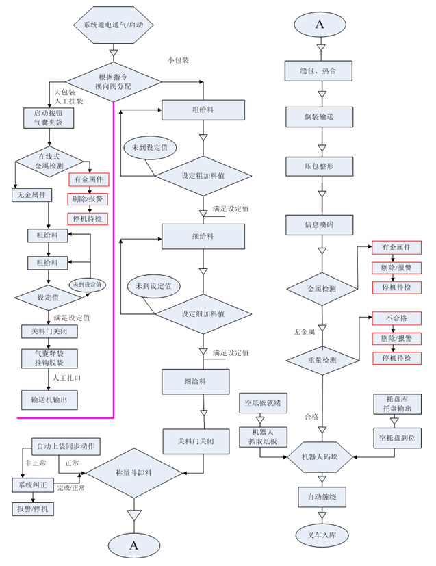 該系統包含了小袋包裝的自動上袋、稱重、輸送、封口、倒袋、噴碼、金屬檢測、重量檢測、碼垛,大袋稱重包裝及其集散控制系統、信息管理系統。
