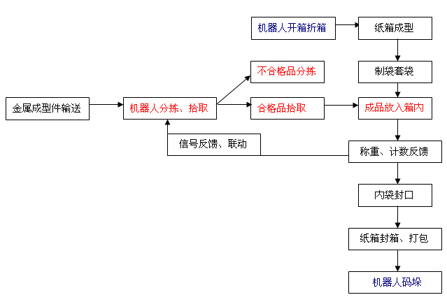 系統(tǒng)概述: 工業(yè)機器人應用技術顧名思義,是在以工業(yè)機器人為載體的前提下,自主研究、開發(fā)機器人在工業(yè)領域具體應用的實用型技術。力馬包裝主旨打造工業(yè)機器人在包裝、物流行業(yè)的技術開發(fā)、推廣應用。 如以下流程示意: 紅色字體部分為機器人A作業(yè)工序,藍色字體部分為機器人B作業(yè)工序: